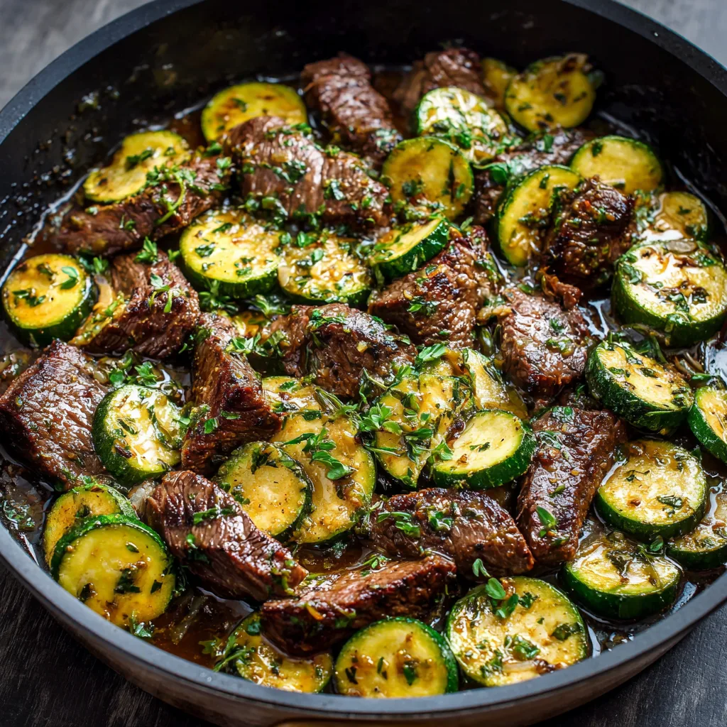 This Garlic Butter Steak & Zucchini is incredibly versatile when it comes to serving, making it easy to adapt for different occasions. For a simple, satisfying dinner, serve it straight from the skillet onto plates or shallow bowls. The glossy garlic butter sauce naturally pools at the bottom, making each bite rich and flavorful without needing anything extra.