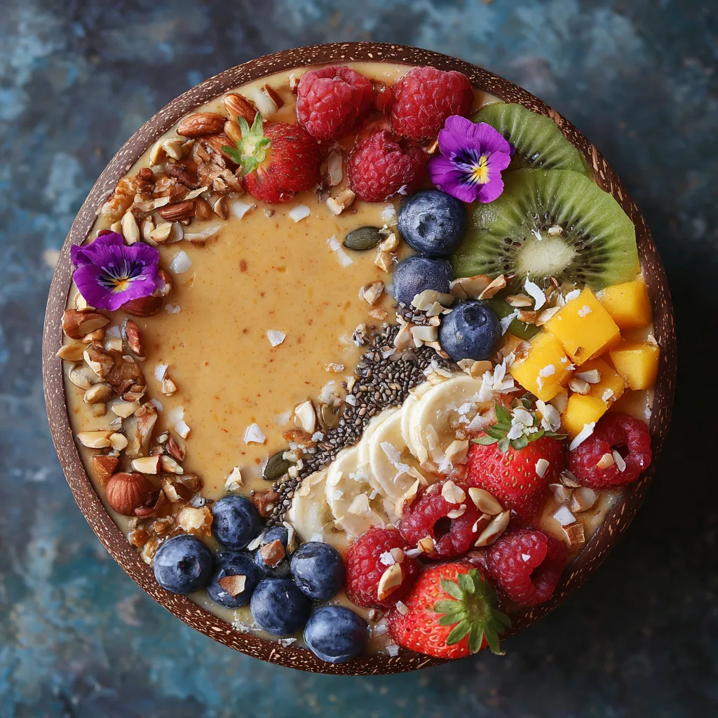Packed with fresh fruits, plant-based milk, and wholesome toppings, this smoothie bowl combines the creamy texture of blended fruit with the crunch of granola, seeds, and nuts. In just a few minutes, you can create a meal that’s rich in vitamins, antioxidants, and natural sweetness—no added sugars or complicated ingredients required.