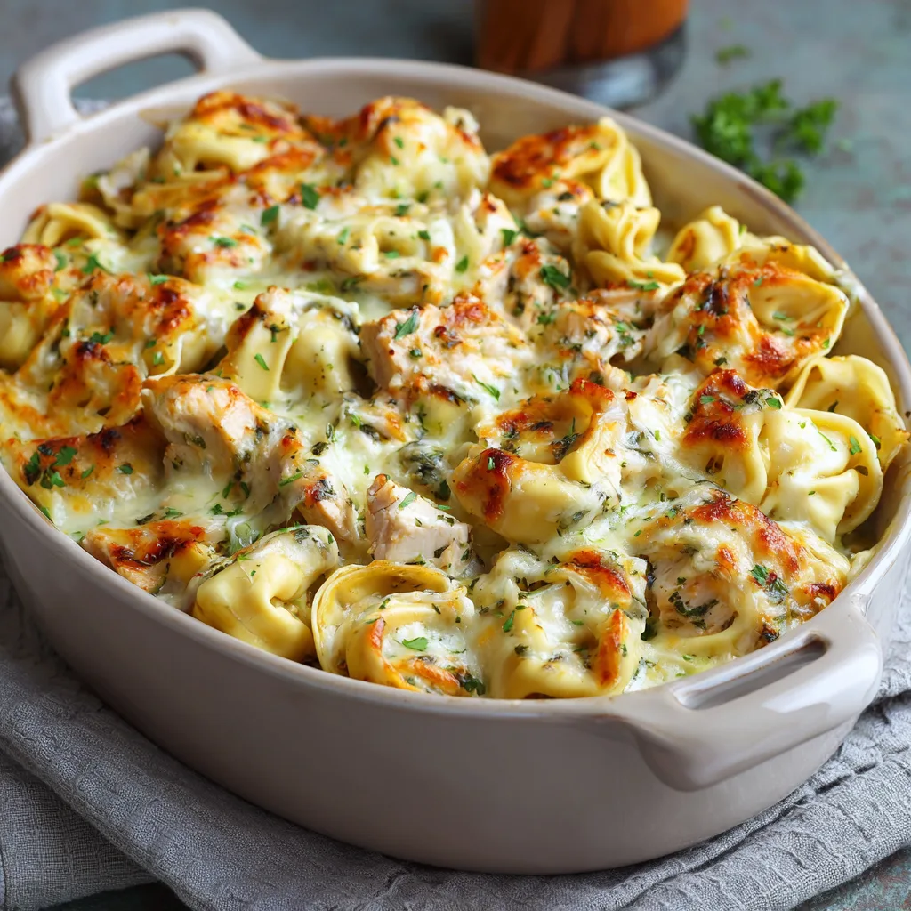 Tender cheese-filled tortellini are tossed with juicy chicken, a creamy sauce, and melted cheese, then baked until bubbly and lightly golden on top. As it cooks, the kitchen fills with the familiar, comforting aroma of garlic, herbs, and cheese—an instant invitation to slow down and enjoy a real meal.