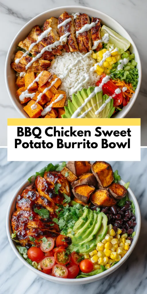 BBQ chicken sweet potato burrito bowl – a high protein healthy dinner idea packed with bold flavor, smoky sweetness, and nutritious ingredients for a satisfying meal.
