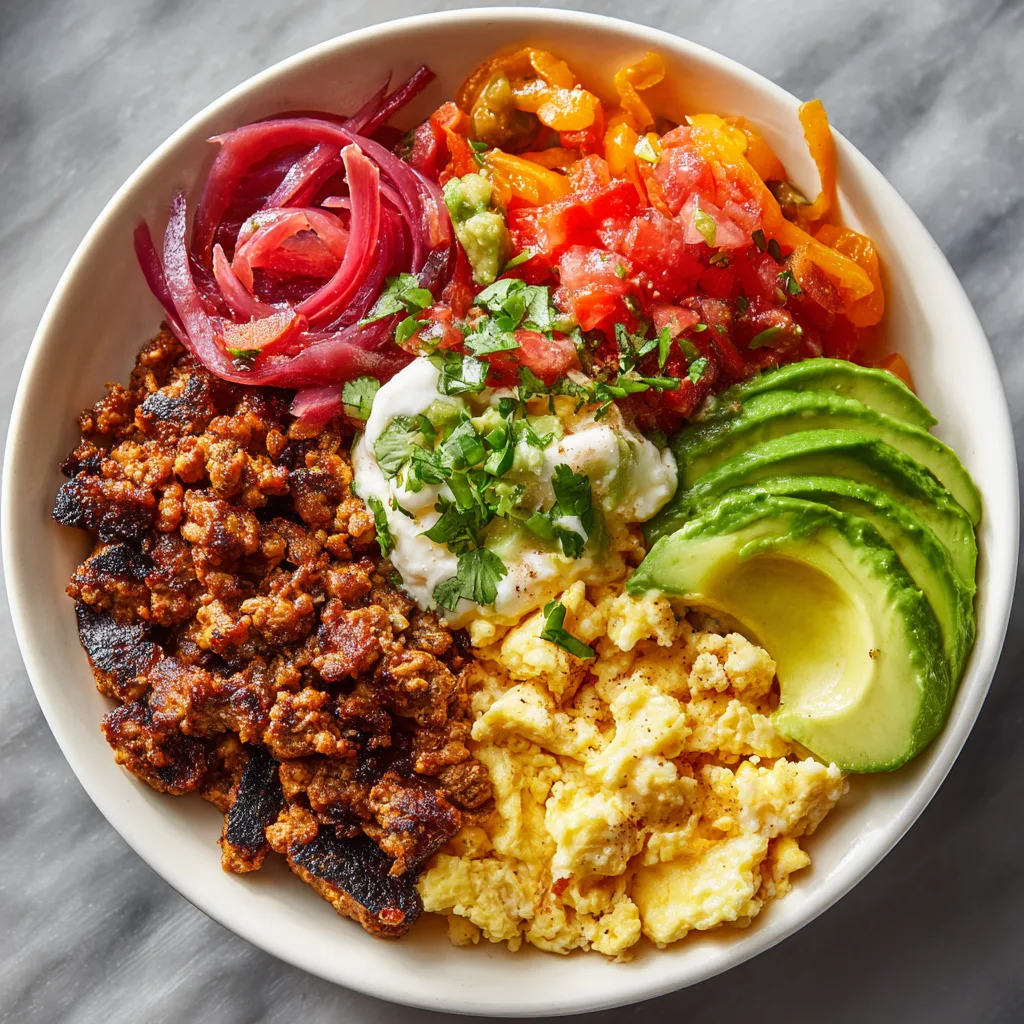 For brunch or family breakfasts, turn this into a build-your-own burrito bowl bar. Keep the egg and protein mixture warm in a skillet, and set out toppings like avocado, salsa, cheese, Greek yogurt or sour cream, hot sauce, and extra herbs. This setup allows everyone to customize their bowl while keeping prep minimal and stress-free.