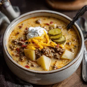 Hi there, food lover! 👋 Ready to dive into a bowl of pure comfort? There’s nothing quite like a steaming pot of Cheeseburger Soup on a chilly evening. 🍲💛 This beloved Midwestern classic brings together all the best parts of a juicy cheeseburger — tender ground beef, creamy melted cheese, hearty potatoes, and flavorful veggies — in one cozy, satisfying bowl. It’s rich, velvety, and oh-so-nostalgic.