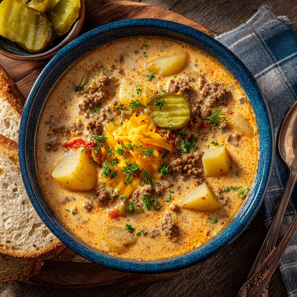 Ladle the soup into bowls and garnish with your favorite toppings — crispy bacon, chopped pickles, or extra cheese. Serve with a side of toasted bread or burger buns for the full experience.