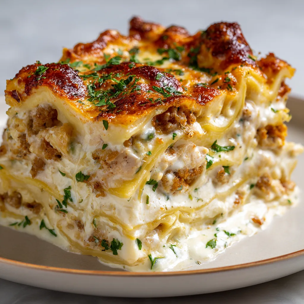 Serve this Chicken Alfredo Lasagna straight from the baking dish for a cozy, family-style presentation, letting the creamy layers speak for themselves. A sprinkle of fresh parsley or cracked black pepper adds contrast and color, while the bubbling cheese creates an irresistible first impression. Pair it with a crisp Caesar salad or lemon-dressed arugula to cut through the richness and refresh the palate.