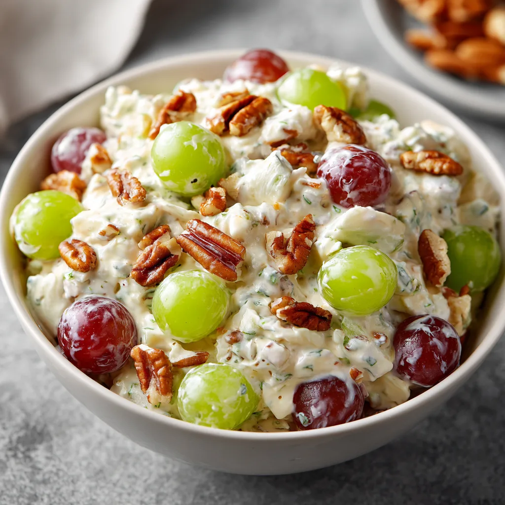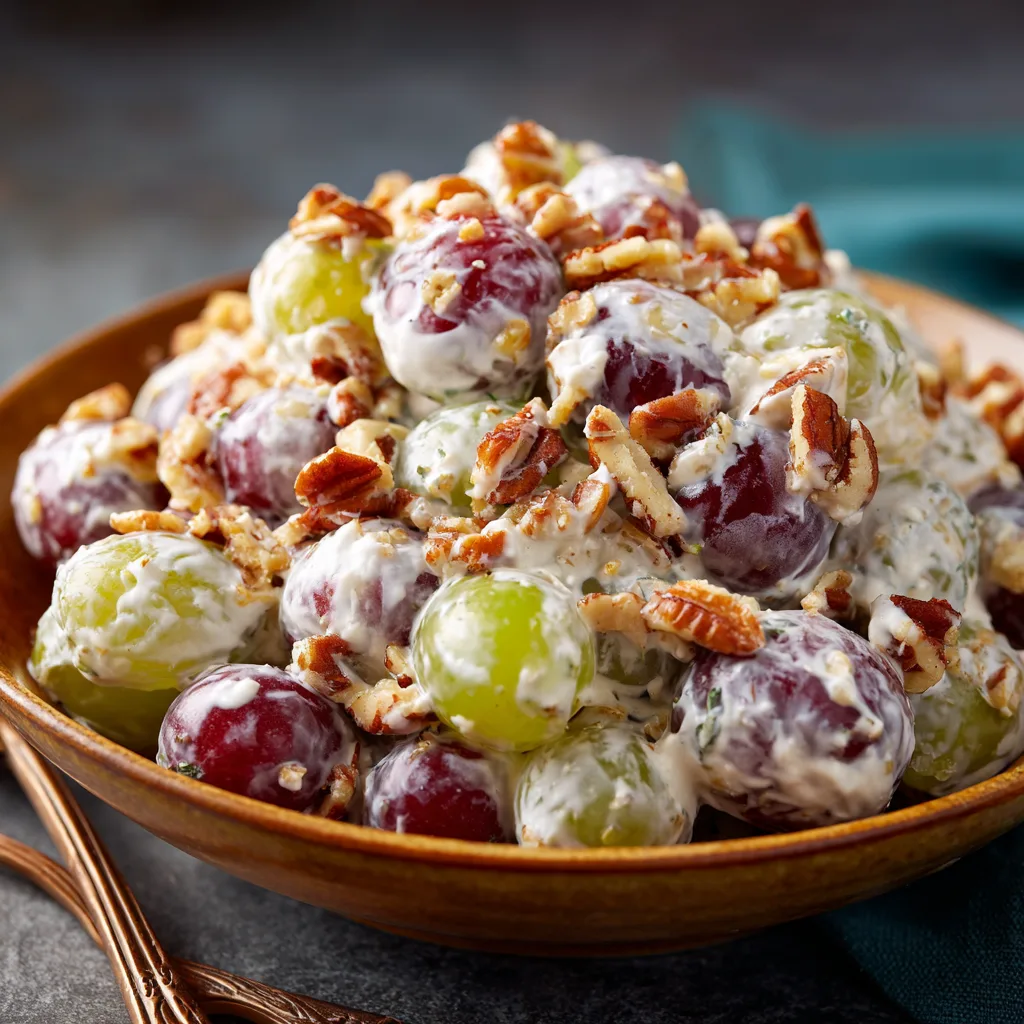 Juicy grapes burst with freshness, wrapped in a silky cream cheese dressing and topped with a brown sugar–pecan crunch that takes everything over the top. It’s rich without being heavy, sweet without being cloying, and absolutely perfect next to savory chicken salad, sandwiches, or barbecue.