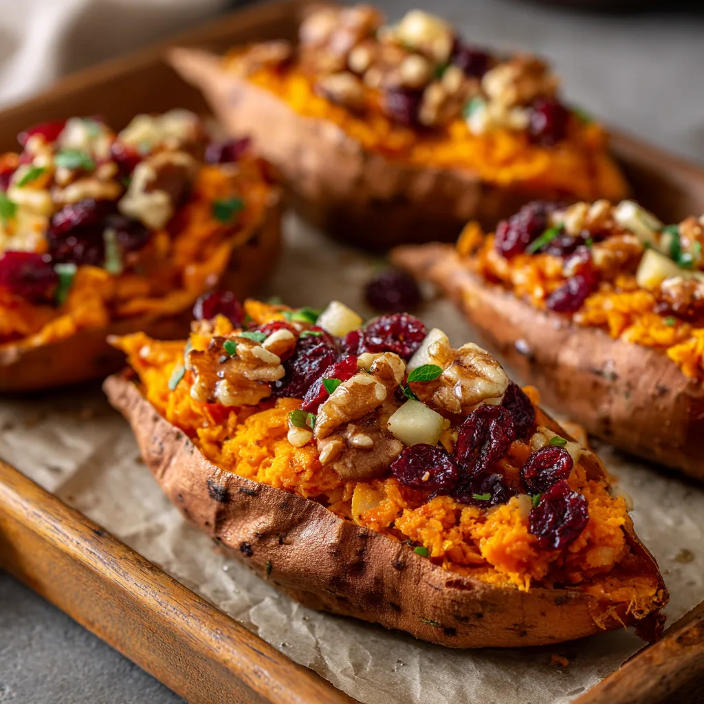 Hi there, food lover! 👋 Ready to warm your home with the cozy, sweet aroma of fall? 🍂 Today’s recipe celebrates the heart of autumn with a dish that brings together the comforting richness of sweet potatoes, the tart pop of cranberries, and the crisp sweetness of apples. These Cranberry Apple Twice-Baked Sweet Potatoes are a rustic favorite — elegant enough for your Thanksgiving table yet simple enough for a cozy weeknight meal. 🥰