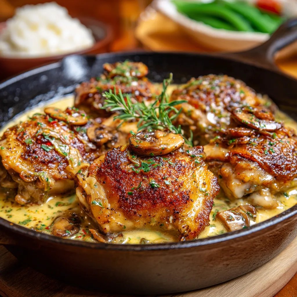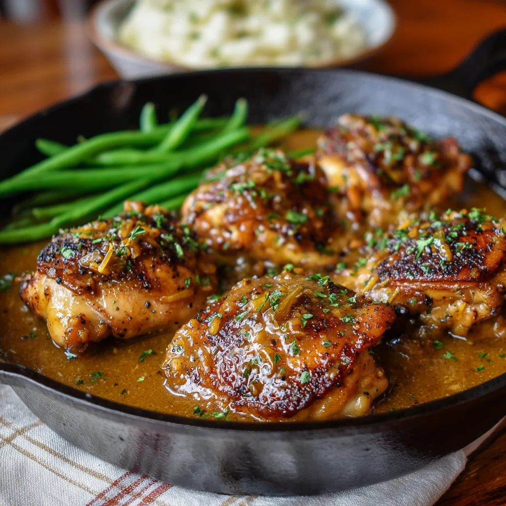 Return the chicken thighs to the skillet. Spoon sauce over the top. Simmer uncovered for 10–12 minutes until the chicken is fully cooked and the sauce thickens. - Finish and Serve: