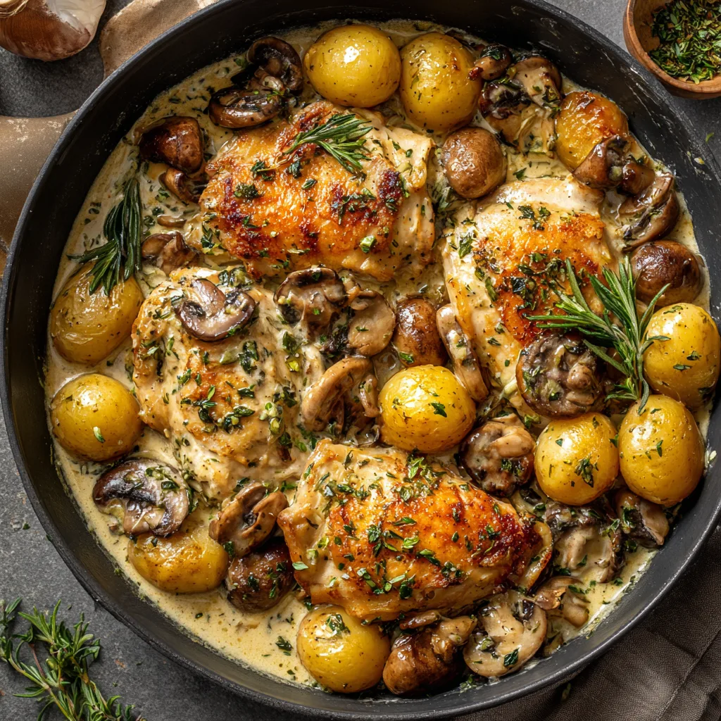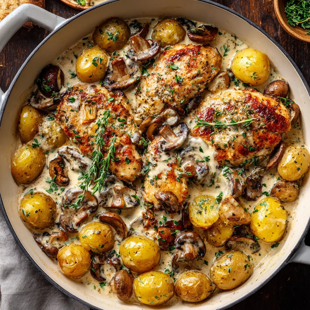 This recipe is perfect for cozy dinners, weekend gatherings, or when you want to impress without stress. The aroma of herbs like thyme, rosemary, and parsley blends beautifully with the creamy garlic sauce, making every bite rich yet balanced. The tender chicken, paired with velvety potatoes and savory mushrooms, creates a complete, hearty meal.