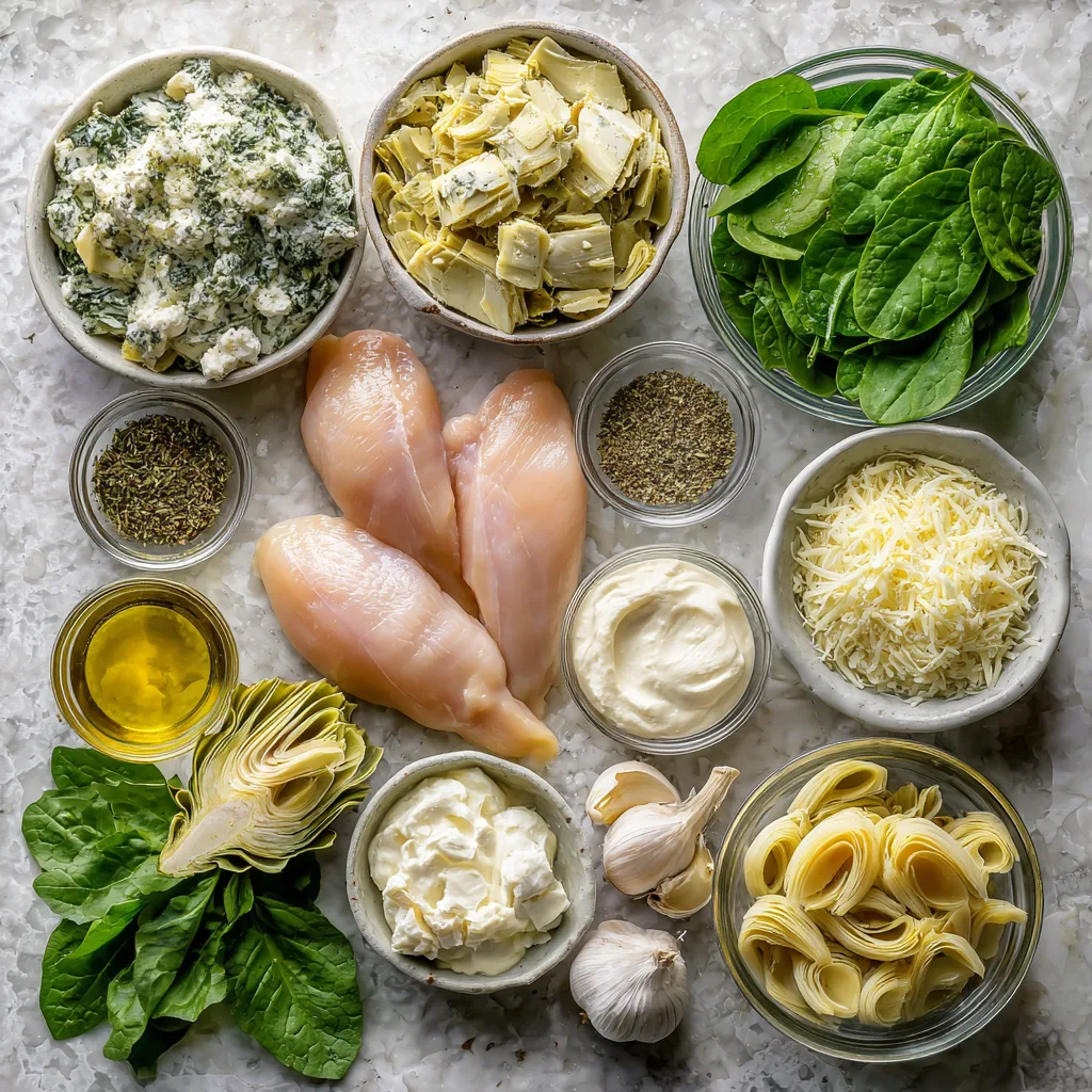 The base of the dish. Chicken breasts provide lean protein and absorb the creamy spinach-artichoke topping beautifully during baking.