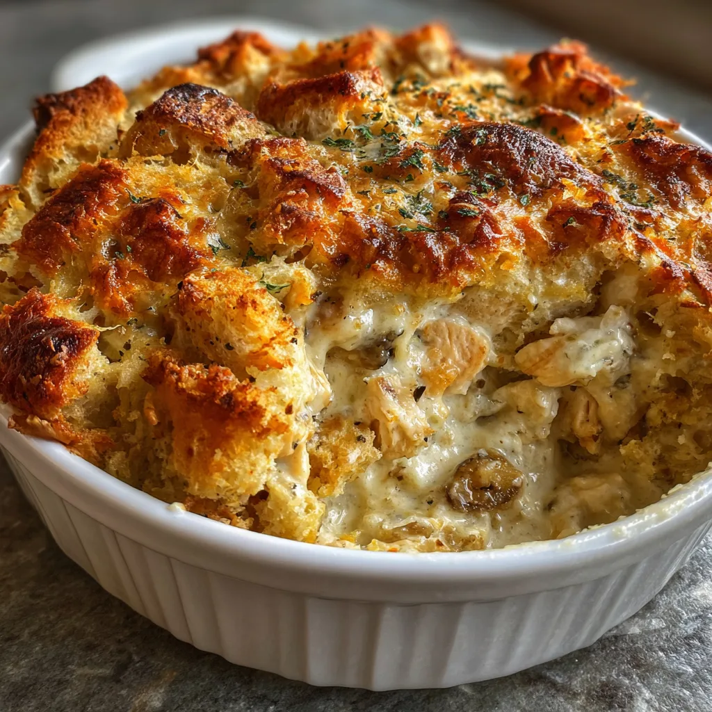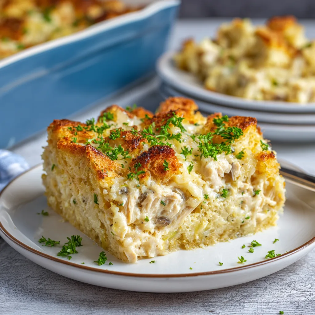 Spread the chicken mixture evenly in your prepared baking dish. Spoon the stuffing mixture on top, gently spreading it to cover the entire surface. Don’t pack it down too tightly — you want it fluffy and crisp once baked!