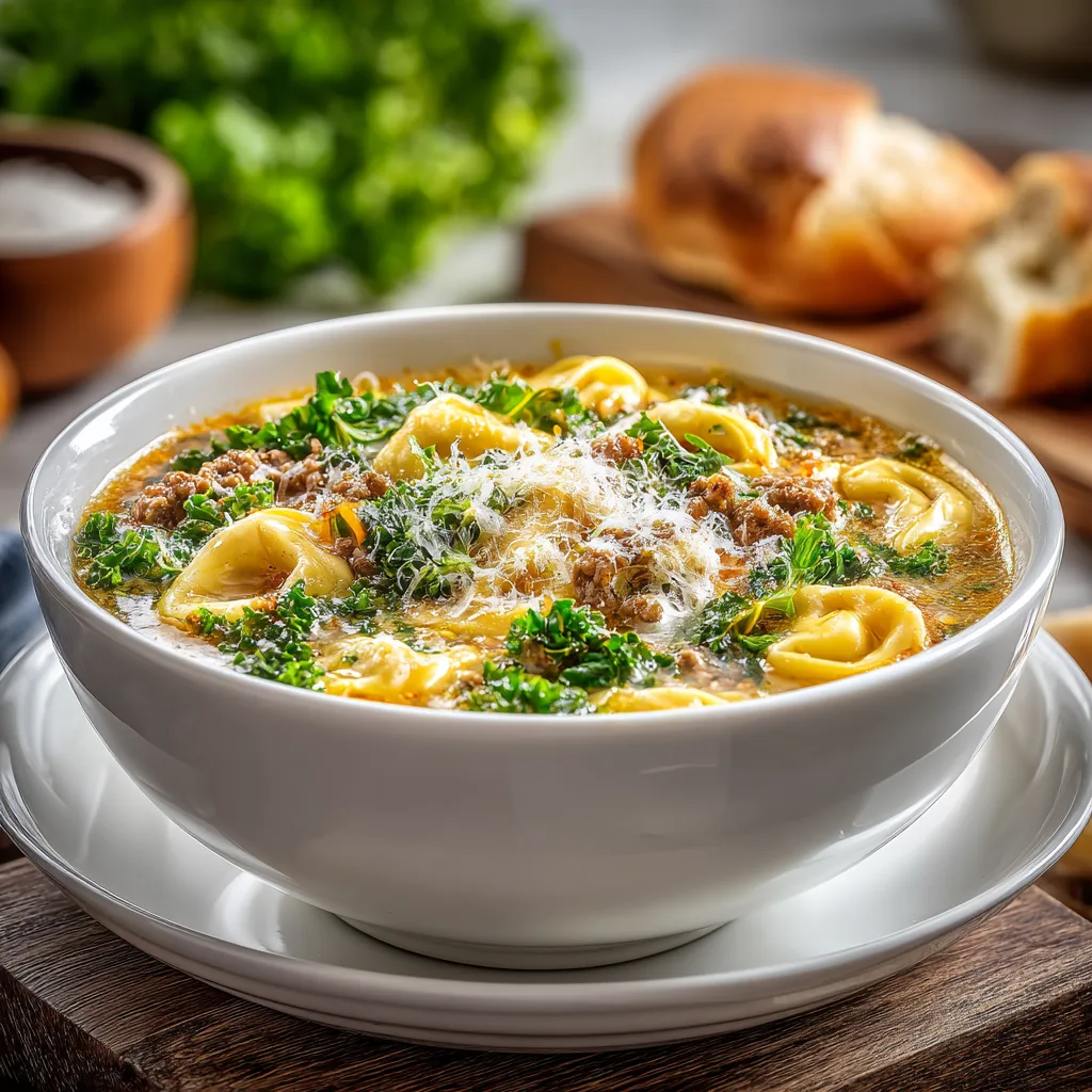 Imagine a spoonful filled with juicy bites of Italian sausage, plump pasta pillows, and a creamy tomato base that smells like an Italian kitchen. The colors alone—rusty red broth, bright green spinach, golden tortellini—make this dish feel like a cozy hug in a bowl. It’s rich, savory, and surprisingly light, giving you comfort without heaviness.