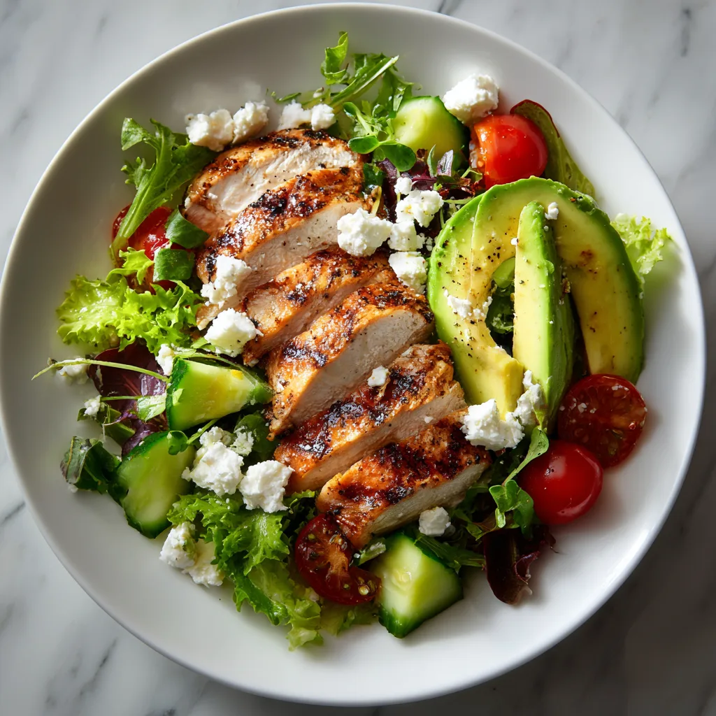 Now it’s time to assemble. Place the sliced grilled chicken on top of the salad base while it’s still slightly warm. Add avocado slices, sprinkle feta cheese, and toss in nuts or seeds for crunch.