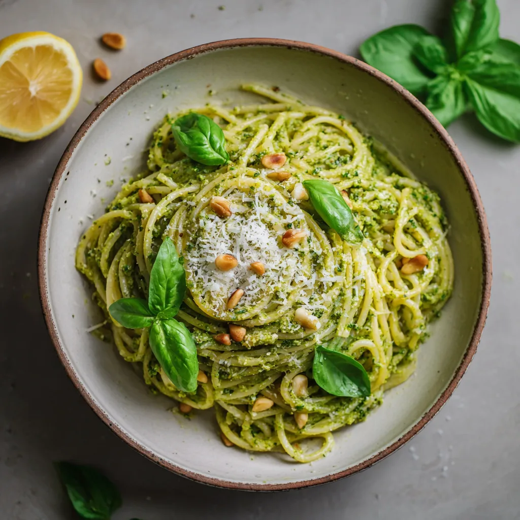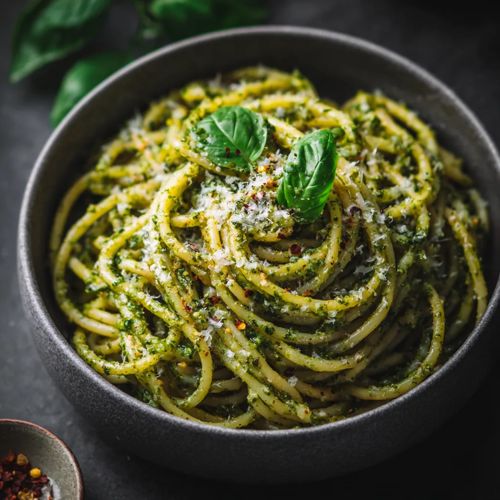 Pesto, originating from Genoa in Northern Italy, is traditionally made by hand using a mortar and pestle (the word “pesto” actually means “to pound” in Italian!). The blend of fragrant basil, sharp Parmesan, rich pine nuts, and smooth olive oil creates a sauce that’s as vibrant as it is versatile. Whether you toss it with spaghetti, penne, or fusilli, this recipe guarantees that each strand of pasta will be coated in pure, garlicky, herby goodness. 😋
