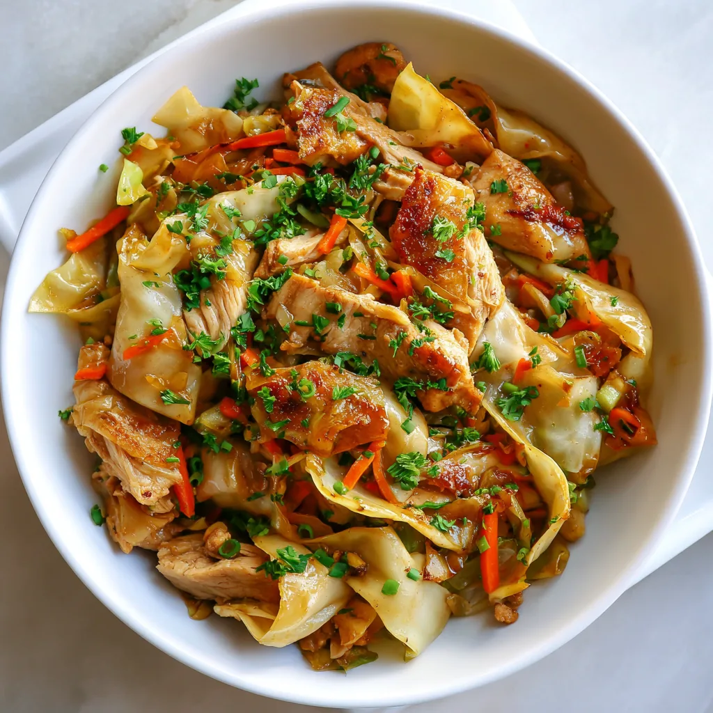 If you love the savory, slightly sweet, deeply satisfying flavors of a classic egg roll but want something lighter, faster, and far more practical for everyday cooking, this Egg Roll in a Bowl with Chicken is exactly what you need. It has all the familiar elements—tender chicken, garlicky aromatics, savory soy sauce, and crisp-tender cabbage—without the wrapper, the frying, or the mess. The result is a skillet full of warm, comforting goodness that smells incredible as it cooks and tastes even better with every bite.
