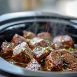 Garlic butter crockpot steak bites are tender, juicy, and packed with rich flavor. Slow-cooked with garlic, herbs, and butter, this easy high-protein meal is perfect for busy weeknights or meal prep.