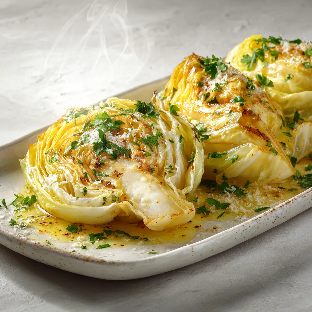 Garlic Butter Melted Cabbage is incredibly versatile and can be served in many different ways depending on the occasion. One of the most appealing ways to present it is family-style on a large platter. Arrange the tender cabbage wedges in overlapping layers, then drizzle some of the remaining garlic butter sauce from the pan over the top. Finish with extra parsley, a sprinkle of Parmesan cheese, and a light crack of black pepper. The golden edges of the cabbage combined with the glossy butter sauce create a dish that looks as comforting as it tastes. It pairs wonderfully with roasted chicken, grilled steak, baked salmon, or even simple roasted potatoes.