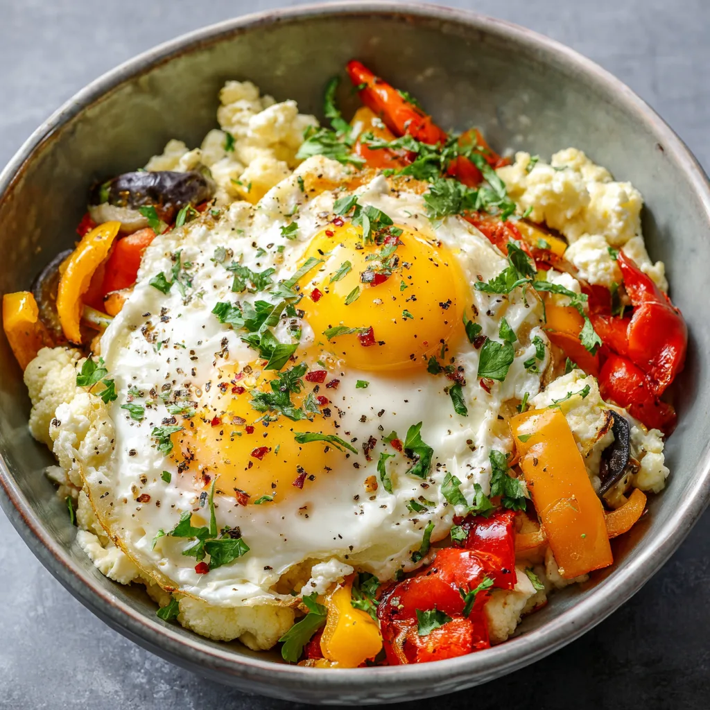 For a more filling brunch-style presentation, pair the bowl with a slice of whole-grain toast or a side of fresh fruit. This adds contrast and makes the meal feel more complete while keeping the bowl itself light and protein-forward. If serving guests, you can prepare the eggs and vegetables ahead of time and assemble individual bowls just before serving, finishing each one with herbs and fresh toppings.