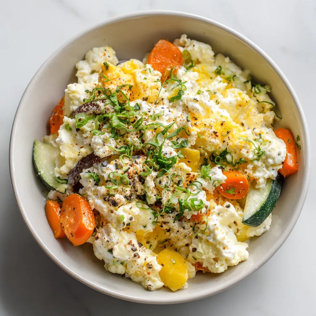 What makes this breakfast bowl truly special is its simplicity paired with impressive nutrition. Cottage cheese adds a major protein boost while keeping the dish clean and mild, allowing the eggs and vegetables to shine. There’s no heaviness, no greasy finish—just balanced, savory flavor that feels energizing rather than indulgent. It’s the kind of breakfast that leaves you feeling clear-headed, fueled, and ready to take on the day.