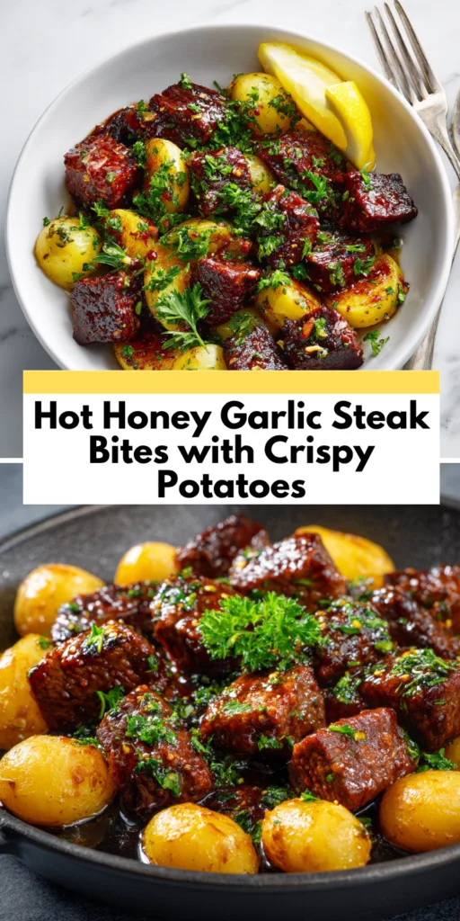 Picture this: golden, crispy potatoes with perfectly caramelized edges, paired with tender steak bites seared to perfection and coated in a glossy hot honey garlic sauce. The aroma alone—rich garlic, sizzling steak, and sweet heat—fills your kitchen with pure comfort.