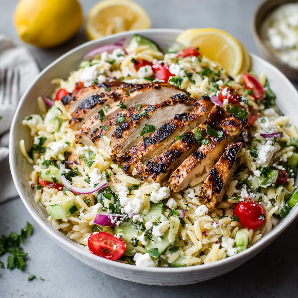 Bright, zesty, and bursting with Mediterranean-inspired flavor, these Lemon Feta Orzo Power Bowls with Grilled Chicken are the kind of meal that feels both nourishing and vibrant. Tender grilled chicken slices rest over a fluffy bed of lemon-kissed orzo, tossed with crisp vegetables, creamy feta, and fresh herbs. Every forkful delivers contrast—warm and savory chicken, cool and crunchy vegetables, briny feta, and a citrusy finish that keeps it light and refreshing.