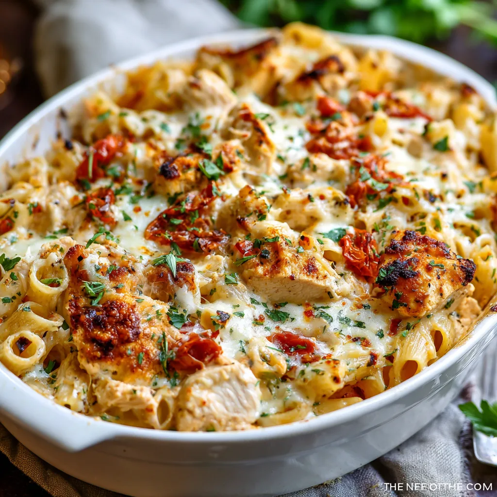 Marry Me Chicken Pasta Bake is best served hot and bubbling, straight from the oven. Bring the baking dish to the table for a cozy, family-style presentation that instantly draws everyone in. The golden cheese on top, creamy sauce underneath, and pops of red from the sun-dried tomatoes make it as beautiful as it is comforting.