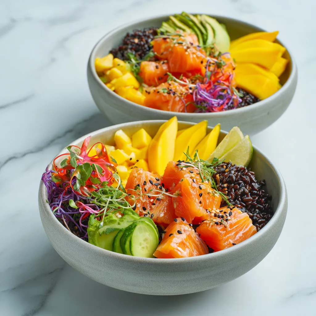 Bright, fresh, and beautifully balanced, these Salmon Poke Bowls with Mango & Black Rice are the kind of meal that feels both nourishing and exciting. Silky cubes of salmon, naturally rich and tender, are paired with sweet, juicy mango and nutty black rice for a bowl that’s as satisfying as it is vibrant. Every bite delivers contrast—cool and creamy avocado, crisp vegetables, citrusy freshness, and savory umami—all layered together in one colorful bowl.