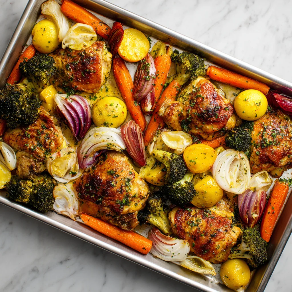 - Bake: Place the sheet pan in the oven and bake for 20–25 minutes, or until the chicken reaches an internal temperature of 165°F (74°C).