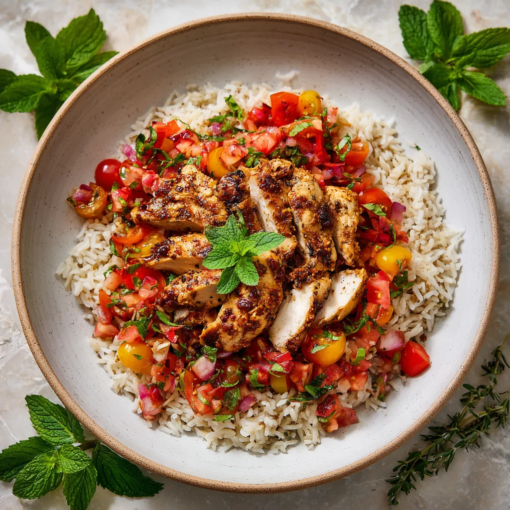 This simple healthy chicken and rice meal with tomato salad is versatile and satisfying. It works as a quick weeknight dinner, a nutritious lunch, or even a meal prep staple for the week. To elevate presentation, serve the meal in a bowl-style format — rice at the bottom, sliced chicken on top, and the colorful tomato salad on the side. A sprinkle of fresh herbs like parsley or dill adds aroma and visual appeal.