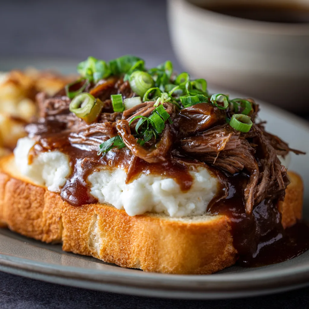 Place a slice of toasted bread on each plate, top with mashed potatoes, shredded beef, and a generous spoonful of rich gravy. Garnish with parsley for a finishing touch.