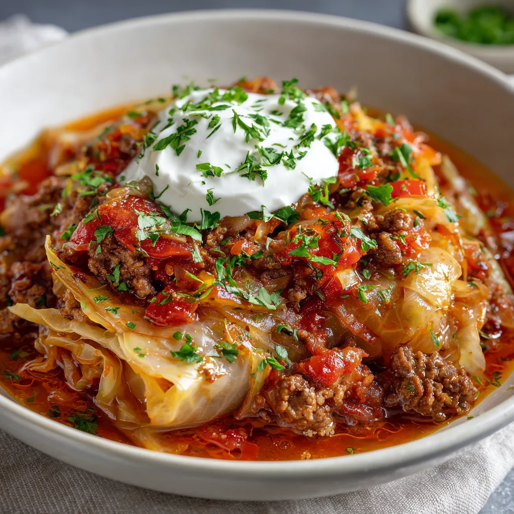 Once done, give everything a gentle stir to combine. Serve hot, topped with chopped parsley and a spoonful of sour cream if desired. Each bowl will be rich, hearty, and bursting with classic cabbage roll flavor.