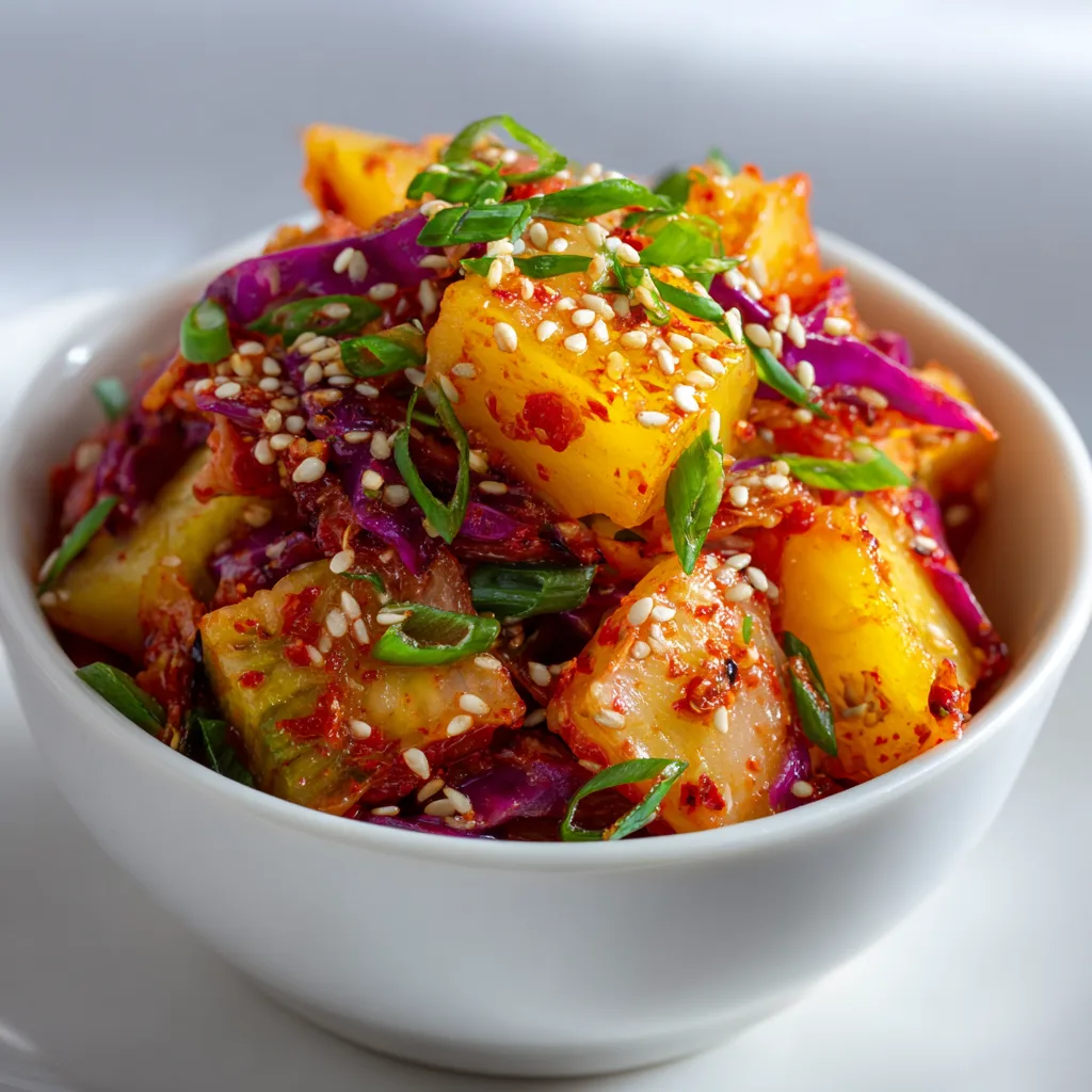 This spicy pineapple kimchi fusion combines sweet, juicy pineapple with bold Korean kimchi flavors. It’s tangy, spicy, refreshing, and perfect as a side dish or topping.