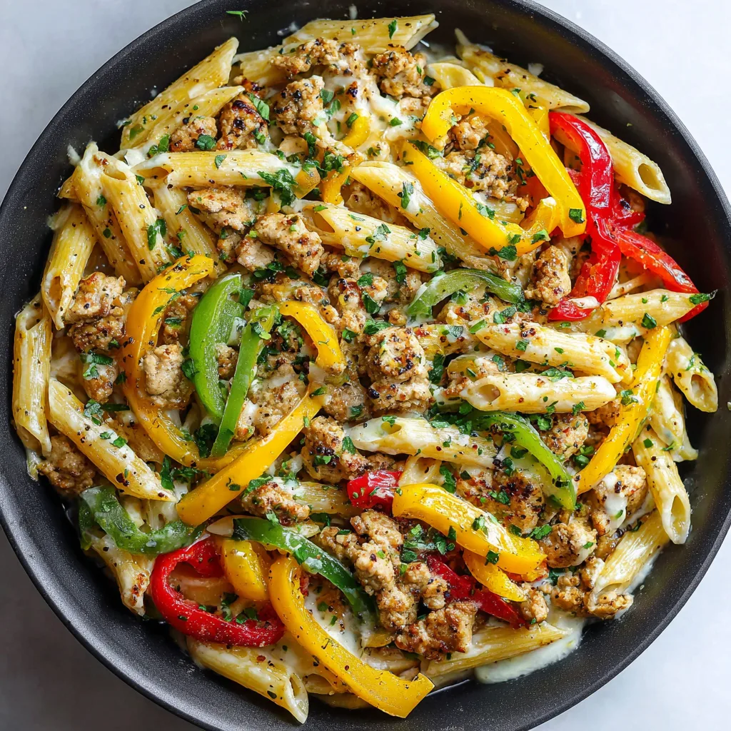 Imagine tender ground chicken seasoned with bold fajita spices, vibrant red and yellow bell peppers softened to sweet perfection, and perfectly cooked pasta coated in a creamy, lightly spiced sauce. The aroma alone — garlic, cumin, paprika, and sautéed onions — fills the kitchen with warmth and comfort. Every bite delivers savory, smoky flavor balanced with just the right amount of creamy indulgence.