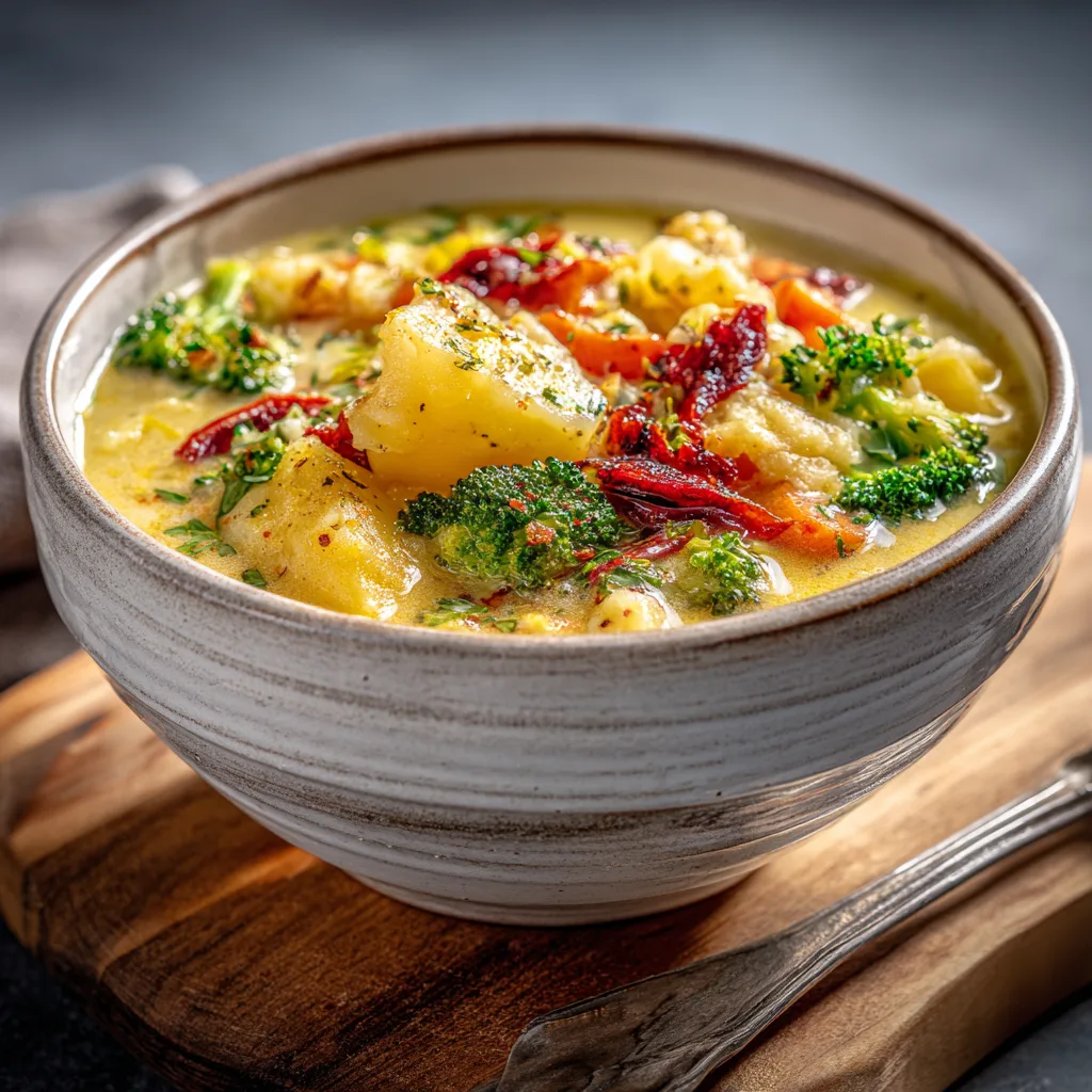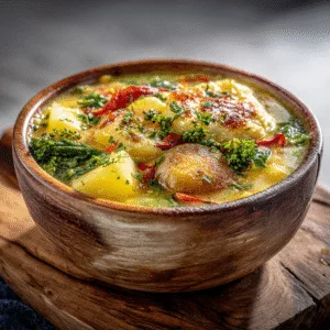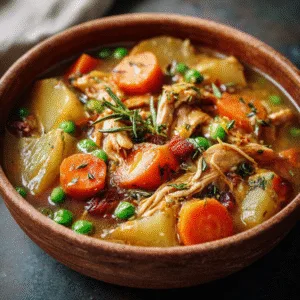 Imagine a pot filled with creamy golden broth, hints of thyme and garlic drifting upward, tender vegetables softened to perfection, and little bites of potatoes and peas giving pops of texture. It’s thick, velvety, and deeply comforting—perfect for chilly evenings, lazy Sundays, or anytime you want warmth in a bowl.