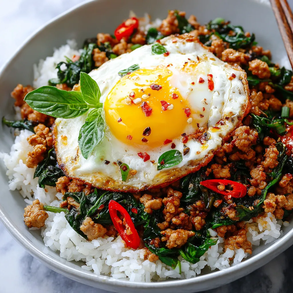 This dish is inspired by the beloved Thai classic Pad Kra Pao Gai — a fiery stir fry of juicy ground chicken tossed with fresh Thai basil, savory sauces, and just the right hint of sweetness. The result? Tender bites of chicken coated in glossy sauce, flecked with vibrant green basil, and balanced between salty, spicy, and slightly sweet.